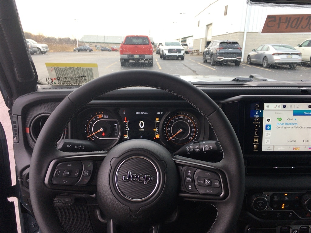 12.3" Touchscreen Display, 4-Wheel Disc Brakes, 4.10 Rear Axle Ratio, 4G LTE Wi-Fi Hot Spot, 8 Speakers, ABS brakes, Air Conditioning, Alloy wheels, Alpine Premium Audio System, AM/FM radio: SiriusXM with 360L, Apple CarPlay, Apple CarPlay/Android Auto, Auto-Dimming Rear-View Mirror, Automatic temperature control, Aux Battery, Auxiliary Switches, Body Color 3-Piece Hard Top, Body Color Rubicon Highline Flare, Brake assist, Class II Receiver Hitch, Cloth Low-Back Bucket Seats, Compass, Connected Travel and Traffic Services, Connectivity - US/Canada, Convenience Group, Delay-off headlights, Driver door bin, Driver vanity mirror, Dual front impact airbags, Dual front side impact airbags, Electronic Stability Control, Emergency communication system: Jeep Connect, For More Info, Call 800-643-2112, Freedom Panel Storage Bag, Front anti-roll bar, Front Bucket Seats, Front Center Armrest w/Storage, Front dual zone A/C, Front fog lights, Front License Plate Bracket, Front reading lights, Fully automatic headlights, Google Android Auto, GPS Navigation, HD Radio, Heated door mirrors, Heated Front Seats, Heated Steering Wheel, Illuminated entry, Integrated Center Stack Radio, Integrated Off-Road Camera, Integrated roll-over protection, Integrated Voice Command with Bluetooth, Low tire pressure warning, MOPAR All-Weather Floor Mats, Non-Lock Fuel Cap Without Discriminator, Occupant sensing airbag, Outside temperature display, Overhead airbag, Panic alarm, ParkView Rear Back-Up Camera, Passenger door bin, Passenger vanity mirror, Performance Suspension, Power door mirrors, Power steering, Power windows, Quick Order Package 24R Rubicon, Radio data system, Radio: Uconnect 5 Navigation with 12.3" Display, Radio: Uconnect 5 with 12.3" Display, Rear anti-roll bar, Rear reading lights, Rear Window Defroster, Rear Window Wiper/Washer, Remote keyless entry, Security system, SiriusXM Radio Service, SiriusXM with 360L, Speed control, Split folding rear seat, Steering wheel mounted audio controls, Stop-Start Dual Battery System, Tachometer, Technology Group, Telescoping steering wheel, Tilt steering wheel, Traction control, Trip computer, Universal Garage Door Opener, Variably intermittent wipers, Voltmeter, Wheels: 17" x 7.5" Machined/Painted Black.