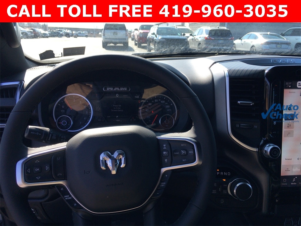 115V Auxiliary Power Outlet, 115V Auxiliary Rear Power Outlet, 12" Touchscreen Display, 2nd Row in Floor Storage Bins, 3 Rear Seat Head Restraints, 4 Way Front Headrests, 4-Wheel Disc Brakes, 400W Inverter, 48V Belt Starter Generator, 4G LTE Wi-Fi Hot Spot, 6 Speakers, 9 Amplified Speakers with Subwoofer, ABS brakes, Accent Color Door Handles, Accent Color Premium Power Mirrors, Accent Color Tailgate Handle, Air Conditioning, Air Conditioning ATC with Dual Zone Control, Alloy wheels, AM/FM radio, Anti-Spin Differential Rear Axle, Apple CarPlay, Apple CarPlay/Android Auto, Auto High-beam Headlights, Auto Power-Folding Mirrors, Auto-Dimming Exterior Driver Mirror, Auto-Dimming Rear-View Mirror, Bed Utility Group, Big Horn Level 2 Equipment Group, Black Exterior Mirrors, Black Exterior Truck Badging, Black Headlamp Bezels, Black Interior Accents, Black Painted Exterior Mirrors Caps, Black Premium Power Mirrors, Black Tail Lamp Bezels, Body Color Fender Flares, Body Color Front Bumper, Body Color Rear Bumper with Step Pads, Brake assist, Bucket Seats, Bumpers: chrome, Center Console Parts Module, Cloth Bucket Seats, Cluster 7.0" TFT Color Display, Compass, Configurable Drive Mode, Connected Travel and Traffic Services, Connectivity - US/Canada, Convex Wide-Angle Exterior Mirror Insert, Delay-off headlights, Deluxe Cloth Bucket Seats, Disassociated Touchscreen Display, Driver door bin, Dual Exhaust with Black Tips, Dual front impact airbags, Dual front side impact airbags, Electronic Stability Control, Exterior 115V AC Outlet, Exterior Mirrors Courtesy Lamps, Exterior Mirrors with Heating Element, Exterior Mirrors with Supplemental Signals, Front anti-roll bar, Front Bucket Seats, Front Center Armrest w/Storage, Front fog lights, Front reading lights, Front Seat Back Map Pockets, Front wheel independent suspension, Full Length Floor Console, Fully automatic headlights, Global Telematics Box Module, Glove Box Lamp, Google Android Auto, GPS Antenna Input, GPS Navigation, Grille Black Surround Black Mesh, HD Radio, Heated door mirrors, Heated Front Seats, Heated Steering Wheel, Illuminated entry, Integrated Center Stack Radio, Integrated Voice Command with Bluetooth, Leather Wrapped Steering Wheel, LED Dome Lamp with on/Off Switch, LED Footwell Lighting, Low tire pressure warning, Manual Adjust 4-Way Driver Seat, Manual Adjust 4-Way Front Passenger Seat, Manual Folding Exterior Mirrors, Media Hub with 2 Charge Only USBs, MOPAR 4 Adjustable Cargo Tie-Down Hooks, MOPAR Front and Rear Rubber Floor Mats, MOPAR Spray in Bedliner, MyFlexCare Service Plan, Night Edition, Occupant sensing airbag, Outside temperature display, Overhead airbag, Overhead console, Overhead LED Lamps, Panic alarm, ParkView Rear Back-Up Camera, Passenger door bin, Passenger vanity mirror, Pick-Up Box Lighting, Power 2-Way Driver Lumbar Adjust, Power Adjust 8-Way Driver Seat, Power Adjustable Pedals, Power door mirrors, Power steering, Power windows, Premium Overhead Console, Quick Order Package 21Z Big Horn, Radio data system, Radio: Uconnect 5 Navigation with 12.0" Display, Radio: Uconnect 5 W with 8.4" Display, RAM Grille Badge - Black, RAM Grille Badge - Chrome, Rear 60/40 Folding Seat, Rear anti-roll bar, Rear Center Armrest, Rear Power Sliding Window, Rear step bumper, Rear Wheelhouse Liners, Rear Window Defroster, Remote keyless entry, Remote Tailgate Release, Security Alarm, SiriusXM Radio Service, SiriusXM with 360L, Speed control, Steering Wheel Mounted Audio Controls, Sun Visors with Illuminated Vanity Mirrors, Supplier Part Tracking (J-1), Tachometer, Telescoping steering wheel, Tilt steering wheel, Traction control, Trip computer, Universal Garage Door Opener, USB Host Flip, Variably intermittent wipers, Voltmeter, Wheels: 20" x 9.0" Aluminum Painted Clad.